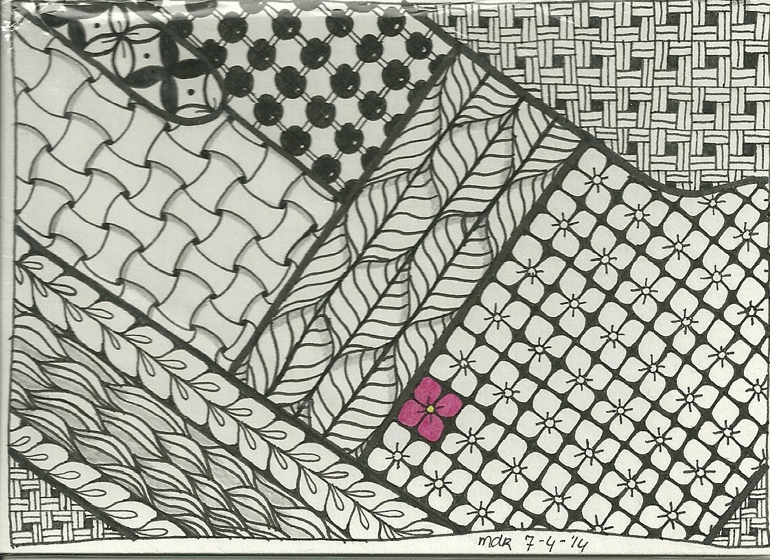 Ik heb een plattegrond van het stukje van de woonwijk waar ik woon uitvergroot en dat gebruikt als vlakverdeling. Ik heb mijn Tangle zwart/ wit gelaten met een klein kleuraccent op de plek van dat roze bloemetje daar woon ik.