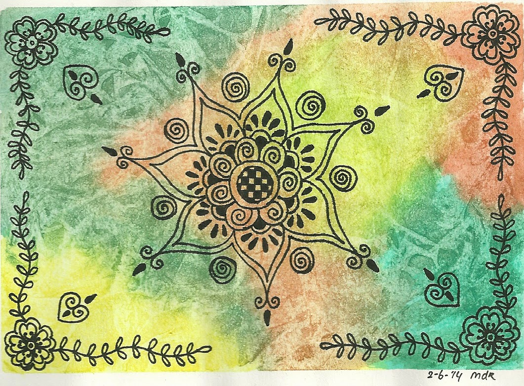Afgelopen week maakte ik nog een kaart. Hier heb ik de achtergrond gemaakt met waterverf en dit laten drogen met vershoudfolie wat je een beetje verfrommeld hebt er op. Nadat het goed is gedroogd heb ik er op getekend, ik heb het boek Traditional Henna designs gebruikt voor inspiratie.
